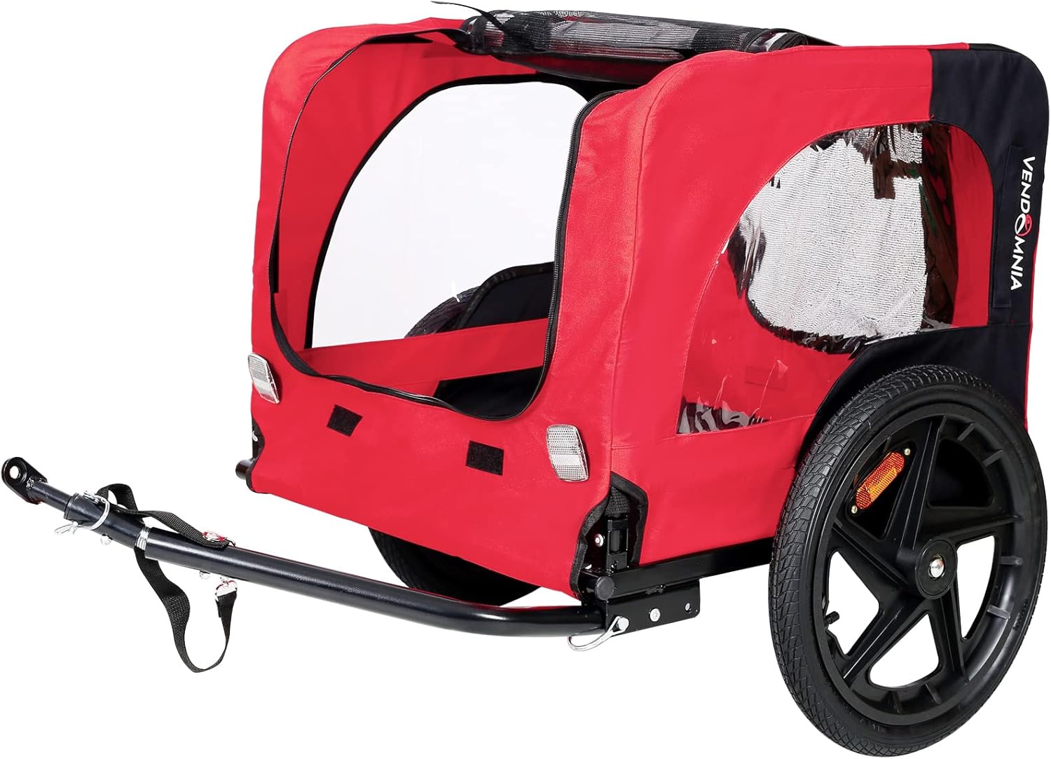 This pet bicycle trailer is the ideal solution if you want take your dog outside on long bike rides. The tubular frame made of powder-coated steel and premium fabric is durable, ensuring a safe and stable ride. The transparent rainproof fabric prevents pets from getting wet when it rains. This lightweight trailer has a universal coupler hitch that easily attaches to almost any bike. The folding-frame design and quick-release wheel make for quick and easy assembly, storage, and transport. In this way, you pet friend can accompany you to all the fun places you go by bike